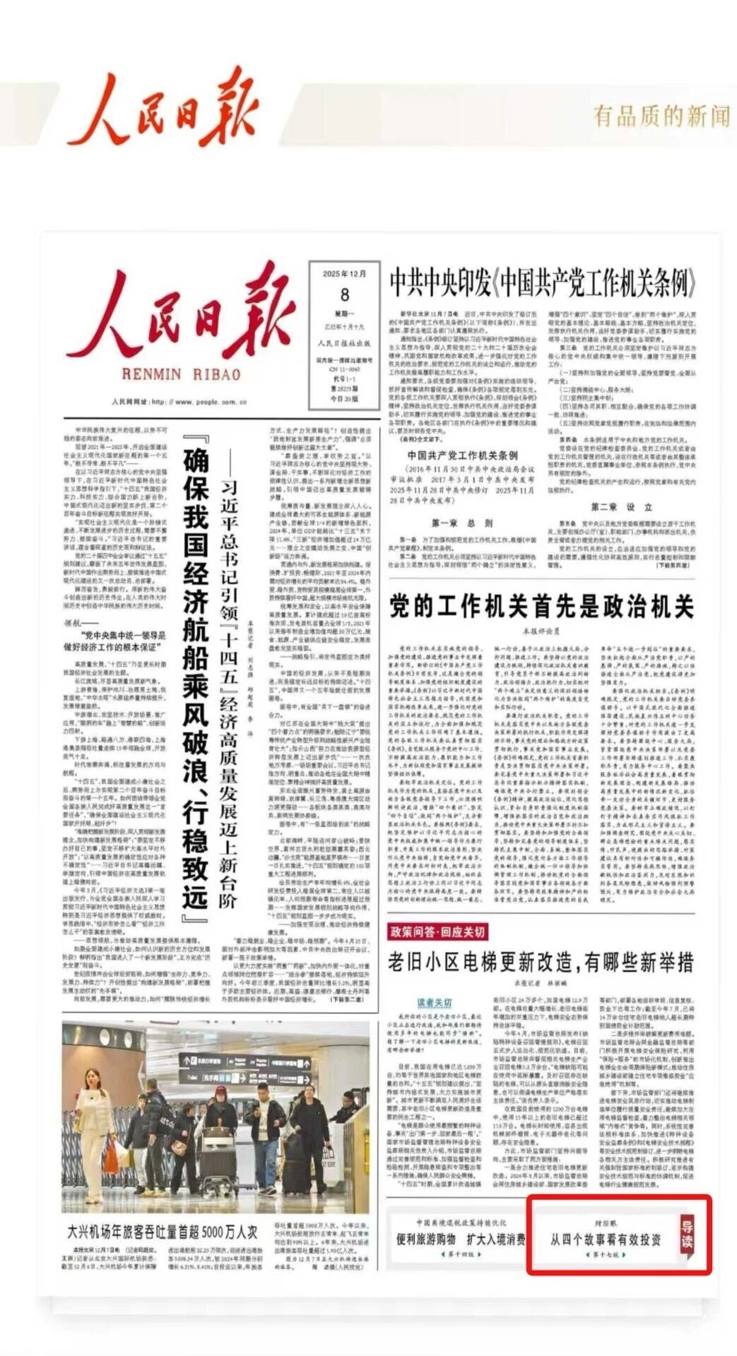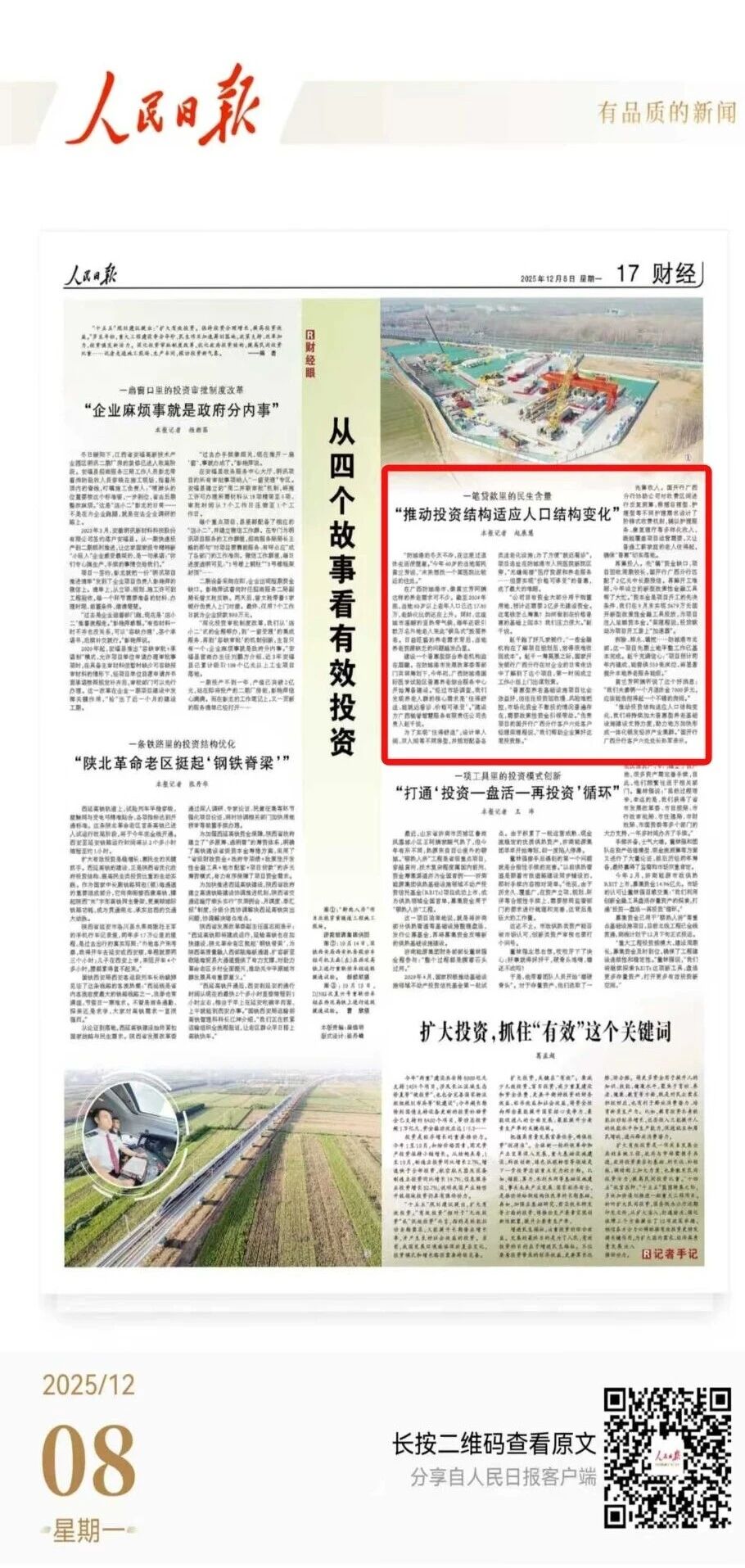 12月8日,《人民日报》财经版报道国开行加大普惠型养老基础设施建设支持力度、助力地方加快形成一体化银发经济产业集群,并在头版对报道做了导读索引。