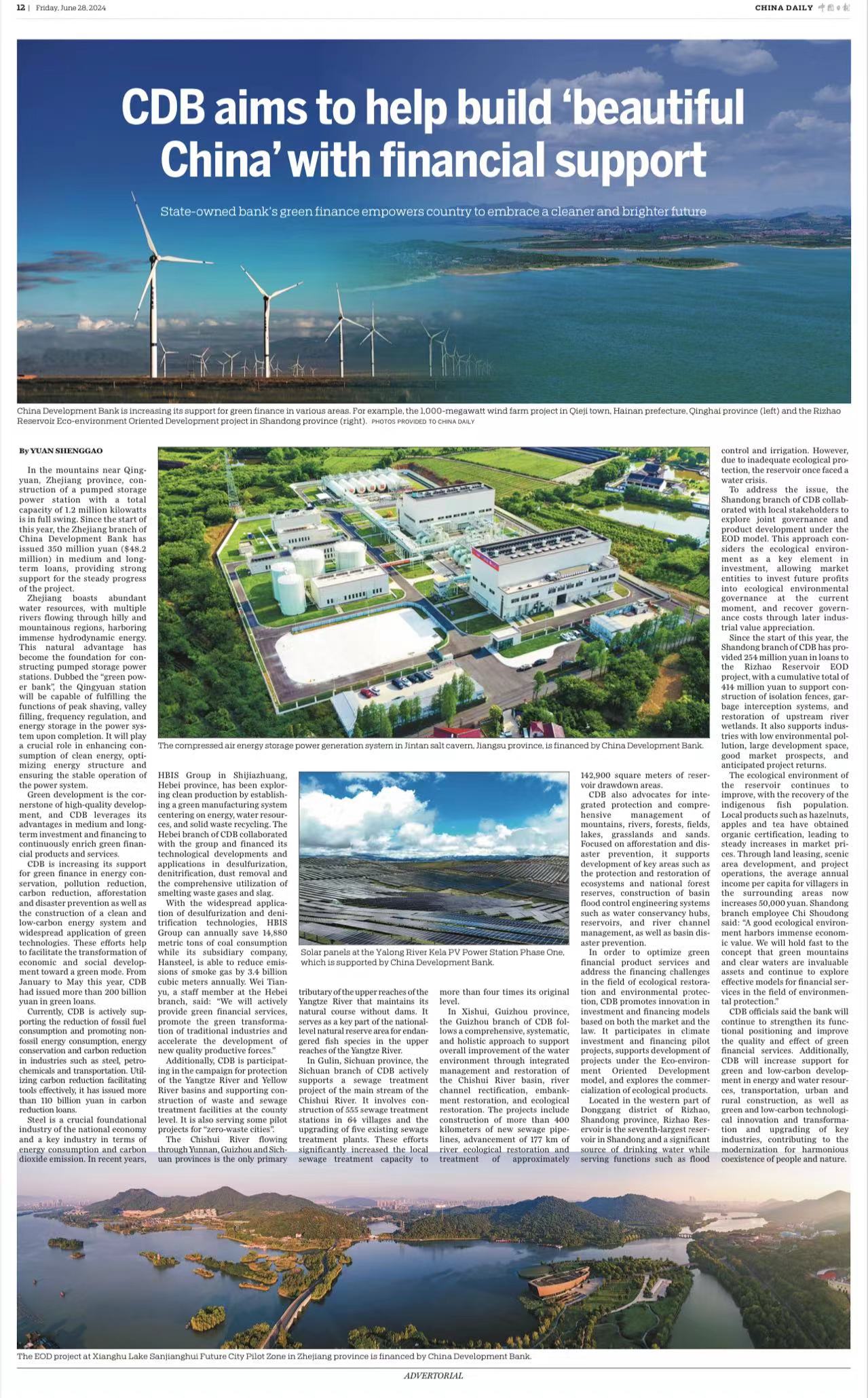 CDB officials said the bank will continue to strengthen its functional positioning and improve the quality and effect of green financial services. Additionally, CDB will increase support for green and low-carbon development in energy and water resources, transportation, urban and rural construction, as well as green and low-carbon technological innovation and transformation and upgrading of key industries, contributing to the modernization for harmonious coexistence of people and nature.