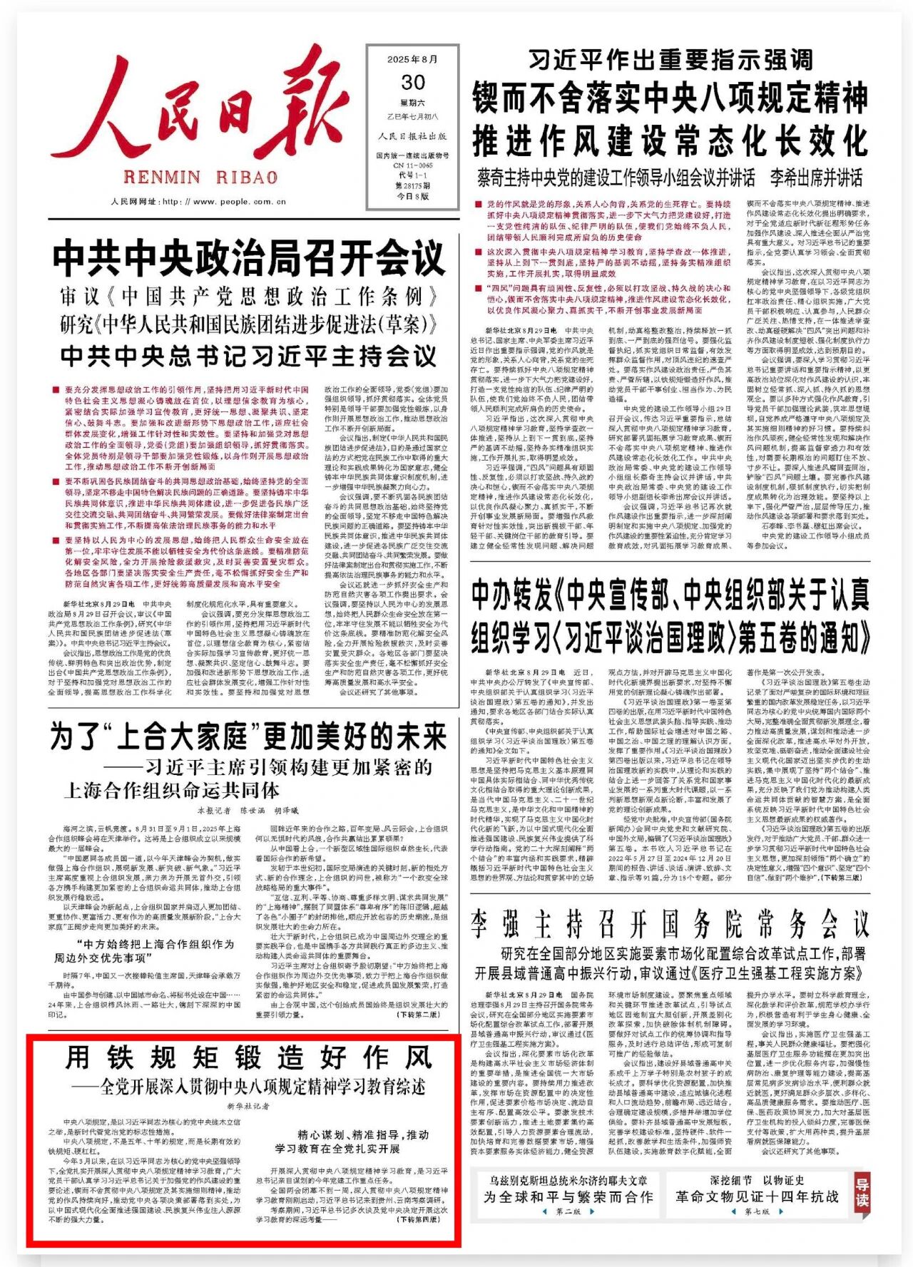 8月29日,新华社刊发《用铁规矩锻造好作风——全党开展深入贯彻中央八项规定精神学习教育综述》。报道指出,“国家开发银行、中国电科、国家电网公司、国家能源集团、中国移动针对不同群体特点,用好各类学习平台,采取宣讲辅导、党员轮训、送学上门等方式,推动学习教育有效覆盖。”8月30日出版的《人民日报》头版刊发该报道。