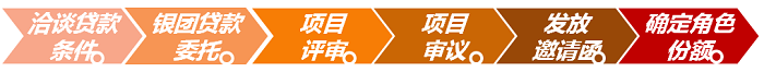 开行作为牵头行筹组银团贷款:借款人与开行初步洽谈有关贷款条件,落实项目组团意向。借款人向开行提交《银团贷款授权委托书》,开行组成工作组对借款人及借款项目进行贷前尽职调查和风险评估,并在此基础上与借款人谈判确定基本贷款条件。工作组编制评审报告,并报贷委会审议。项目经贷委会审议通过后,工作组向潜在参加行发送《银团贷款邀请函》,收到反馈后,综合考虑合作关系,并与借款人协商的基础上,确定各银团参加行角色及承贷份额。