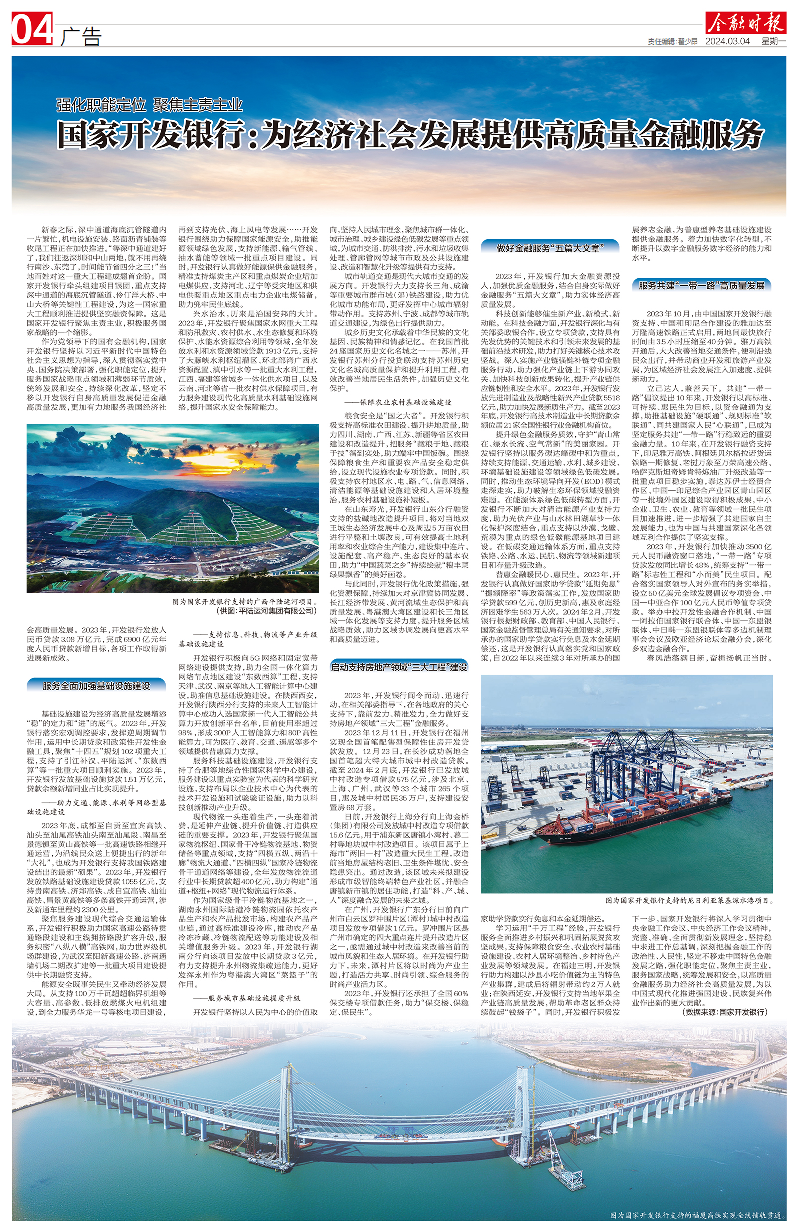 2023年,开发银行加大金融资源投入,加强优质金融服务,结合自身实际做好金融服务“五篇大文章”,助力实体经济高质量发展。