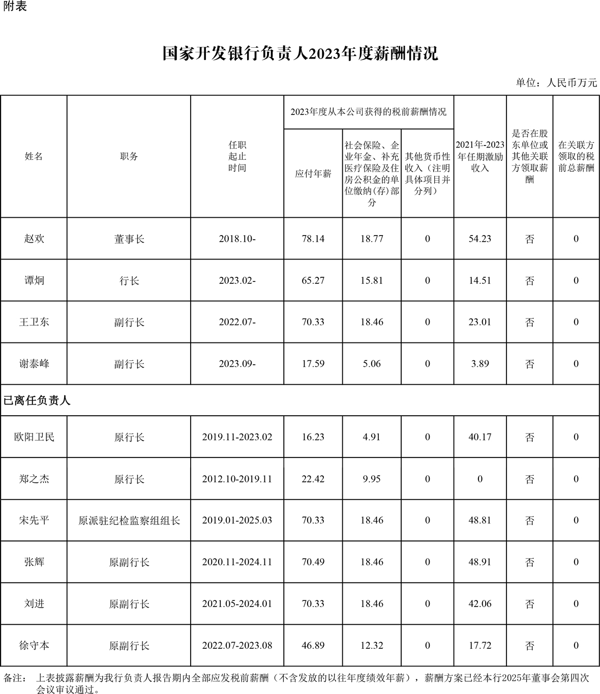 国家开发银行负责人薪酬按照国家关于中央管理企业负责人薪酬制度改革的有关精神和要求执行。根据有关规定,现公开披露国家开发银行负责人2023年度薪酬。
